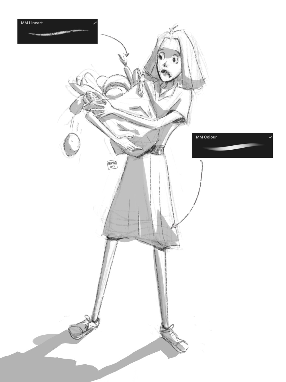- Two sketch brushes (textured and smooth) - Two colour brushes (textured and smooth) - Lineart brush - Shading brush - Highlight brush - Blush brush - Two hair brushes - Extra brush perfect for smudging